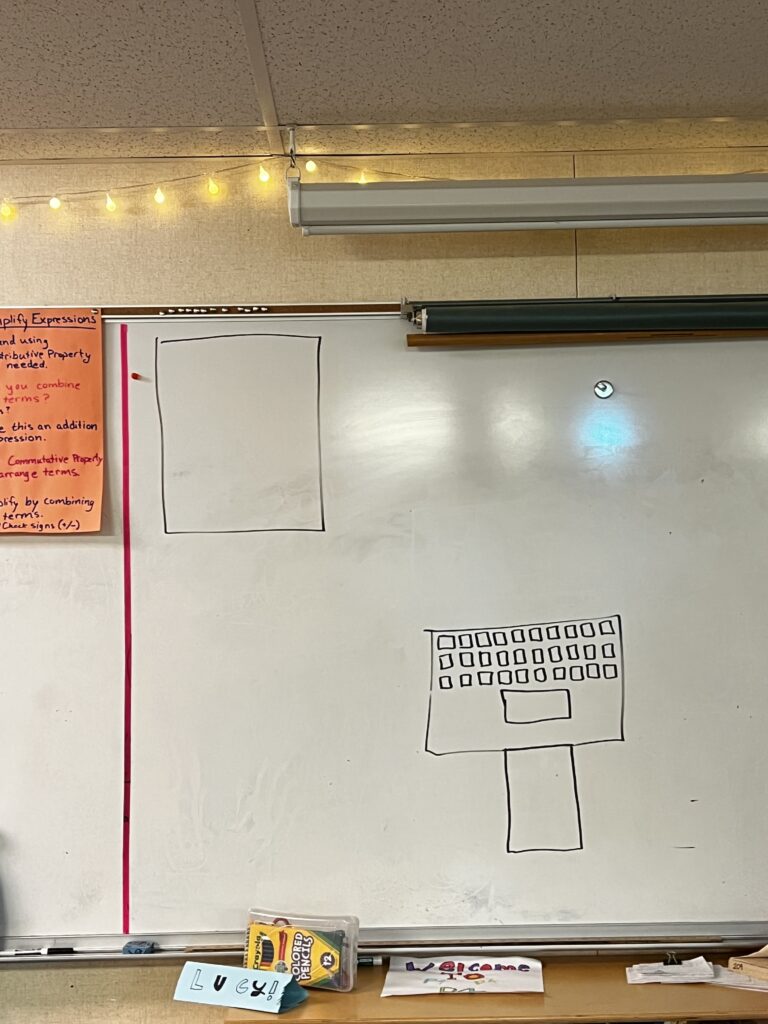 Upon reentering the room, I asked the students to share what was in their minds about what I should draw. I made it a point to take them extremely literally. If they told me to draw a circle, but did not mention the size, I would draw a circle the size of a U.S. quarter. If they told me to “make a larger circle,” I would draw one only slightly larger in diameter. As the picture below shows, if they told me to “draw another rectangle,” I would put it somewhere else on the board entirely (see the upper left corner in the picture below). In the other picture below, you can see that the direction was given to “draw a bill,” so I drew a dollar bill. Doing this results in strange looking drawings – we had dogs with legs coming out of their heads, a duck with feathers perpendicular to their body, and a school building that looked like a prison (though truthfully, that may have been what the students were going for in that case). In one round we drew, erased, and redrew a single circle over twenty times as each student sought to improve on the communication of previous students.